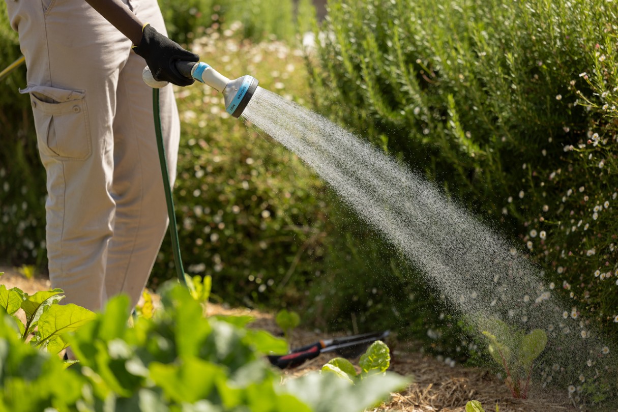 The most efficient and effective watering system is a sub-surface drip hose, connected to a timer to water overnight. This ensures plants get water near their roots, and minimises water loss to evaporation